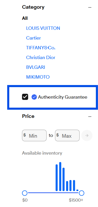 3. 左側のフィルターリストに表示される「Authenticity Guarantee」をチェックすると、対象商品のみが閲覧できます。