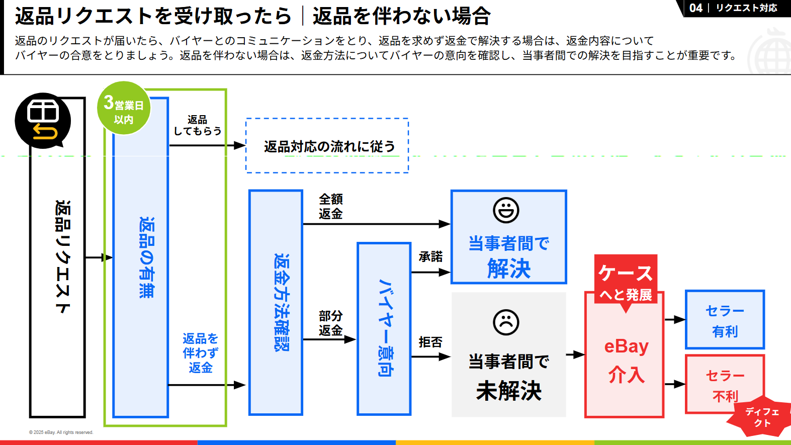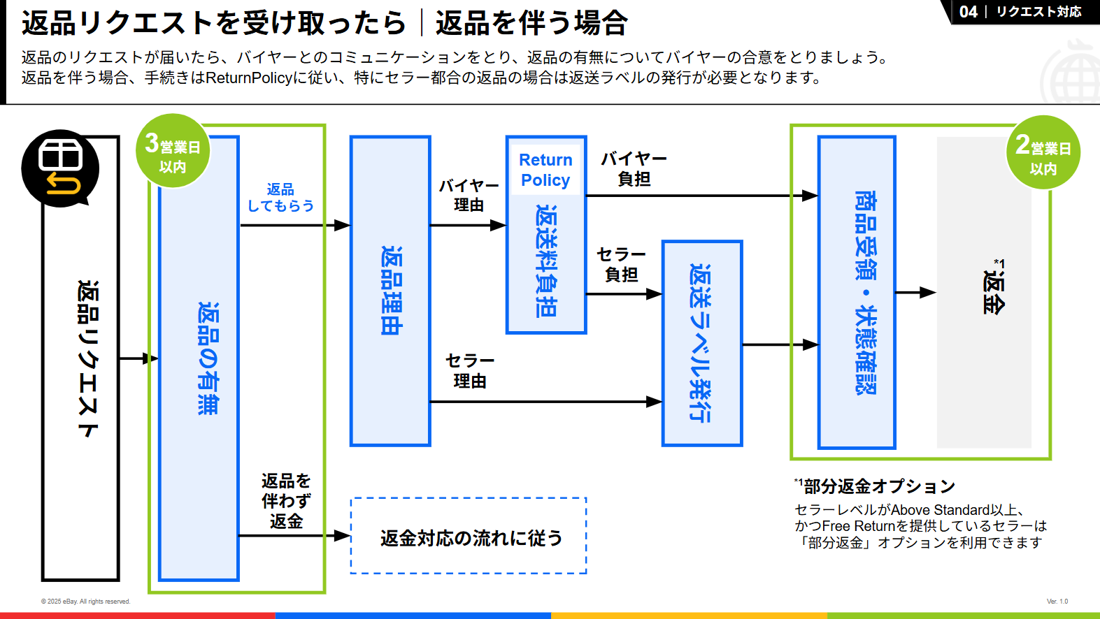 →返送料はセラー負担。セラー対応期間(SMIR:Seller-Make-It-Right)である3営業日*以内にバイヤーとReturn Request内もしくは [My eBay] のメッセージ機能を通じてコミュニケーションを行い、次のステップを踏む。