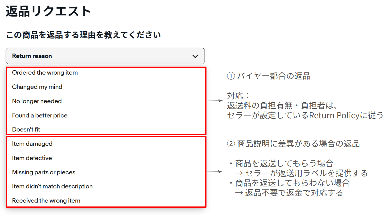 バイヤーが返品リクエストを開くとき、その理由は大きく分けて2種類あります。