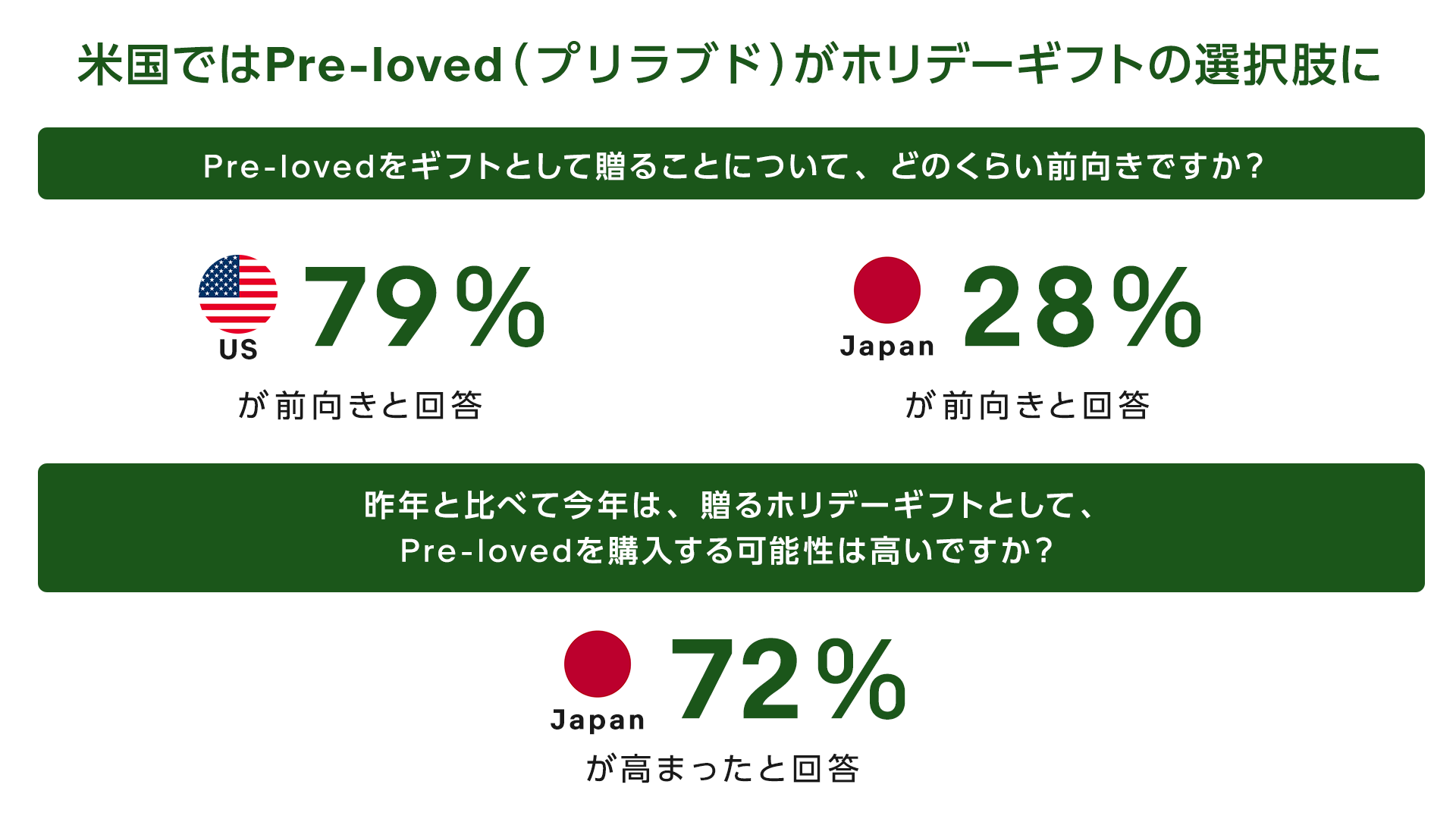 ホリデーシーズンにおけるギフト選びに変化が現れています。特にリコマース文化が先行する米国では、 eBay の調査で 79%が「Pre-loved(プリラブド、中古品の新しい呼び方、前の所有者に大切にされてい た品)を贈り物として贈る可能性がある」と回答しており、贈り物は新品でなければならないという固定 観念は過去のものとなりつつあります。日本においては 28%にとどまっていますが、72%が「昨年と比較して、Pre-loved を贈り物として選ぶ可能性が高まった」と回答しており、ユニークな一点物や価値あ るヴィンテージ品を贈る価値観が、今後新たな選択肢として日本に広がる余地を示しています。