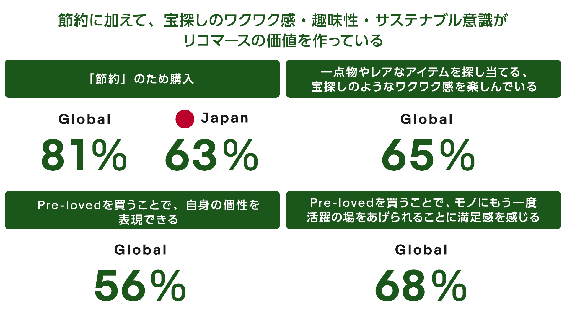 Pre-loved の選択は、節約だけが理由ではありません。他の情緒的な価値によって、リコマースは楽しま れています。eBay の調査では、世界の消費者の 65%が、一点物やレアなアイテムを探し当てる、宝探しの ようなワクワク感を楽しんでいます。また、56%が「Pre-loved を買うことで、自身の個性を表現できる」 と回答しており、リコマースそのものを趣味とする文化があります。さらに、68%が、「Pre-loved を買う ことで、モノにもう一度活躍の場をあげられることに満足感を感じる」と回答しており、廃棄を減らしてモ ノを大切に使い継ぐというサステナブルな行動が生まれています。単なる安価な代替品探しではなく、自身 のスタイルや趣味、サステナブル意識などを追求する手段としてもリコマースが選ばれています。