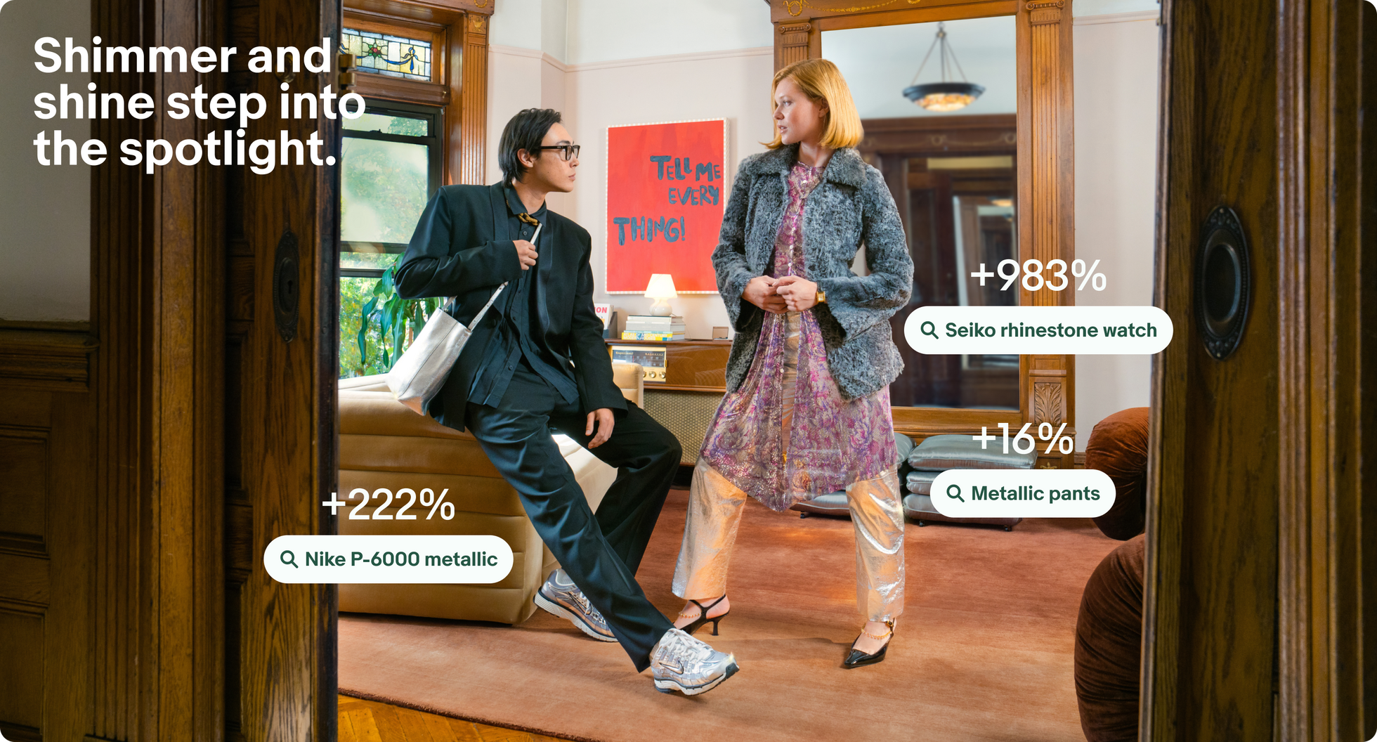 ラインストーン付きのセイコーの腕時計は検索数が+983%、Nike のメタリック「P-6000」スニーカーも +222%と大きく注目を集めています。また、Y2K(Year 2000)リバイバル(1990 年代後半~2000 年 代後半に流行したファッションやカルチャーが、現代の Z 世代を中心に再燃するトレンド)の影響もあり、 メタリックパンツも再びトレンドに(+16%)なっています。