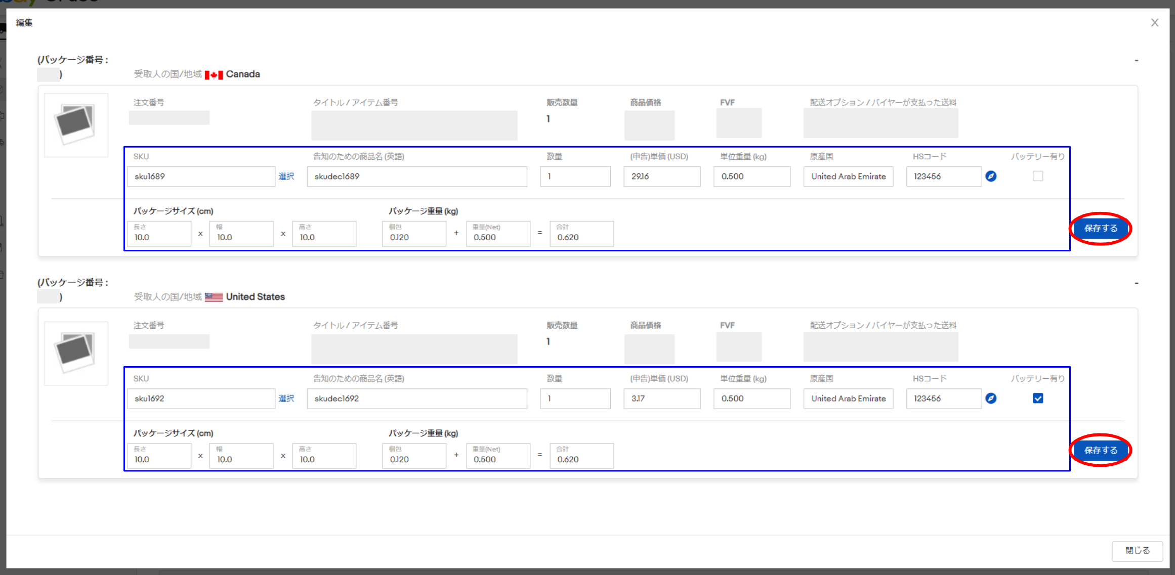 - 編集ウィンドウが開いたら、画像の青枠内の項目を確認・編集し、各注文ごとに必ず[保存する]をクリックしてから、ウィンドウを閉じてください。