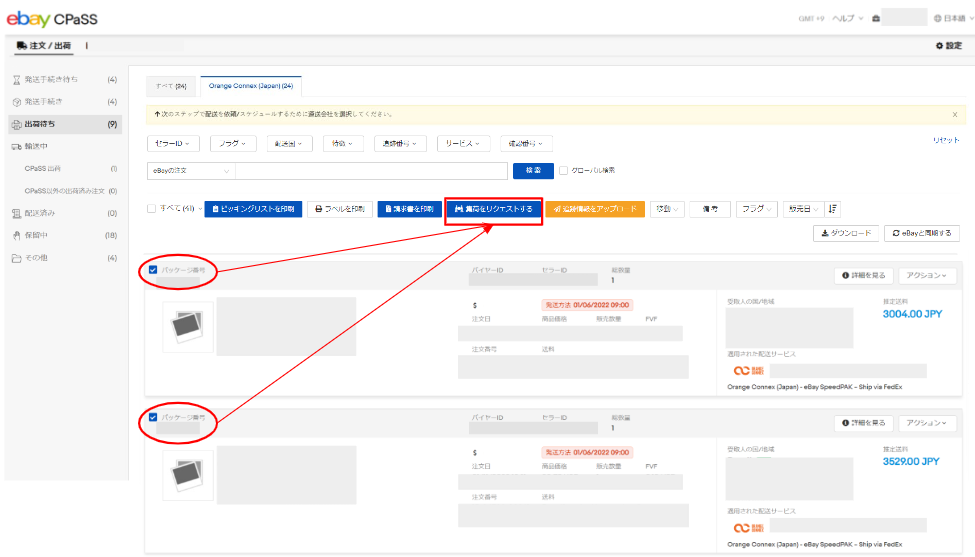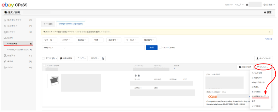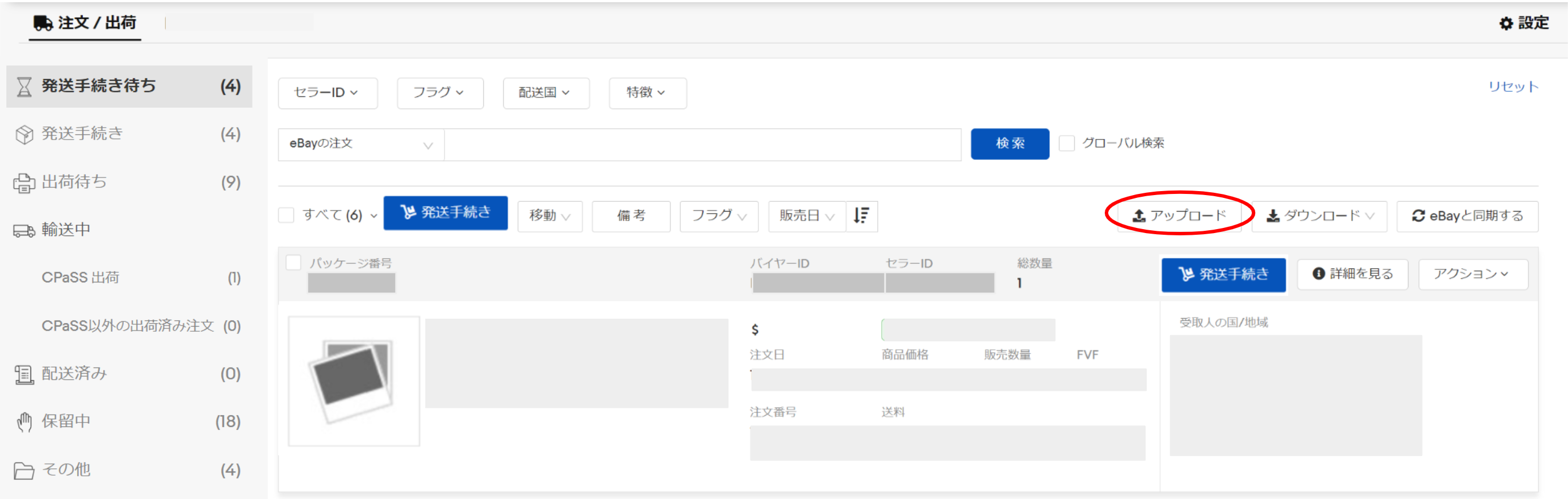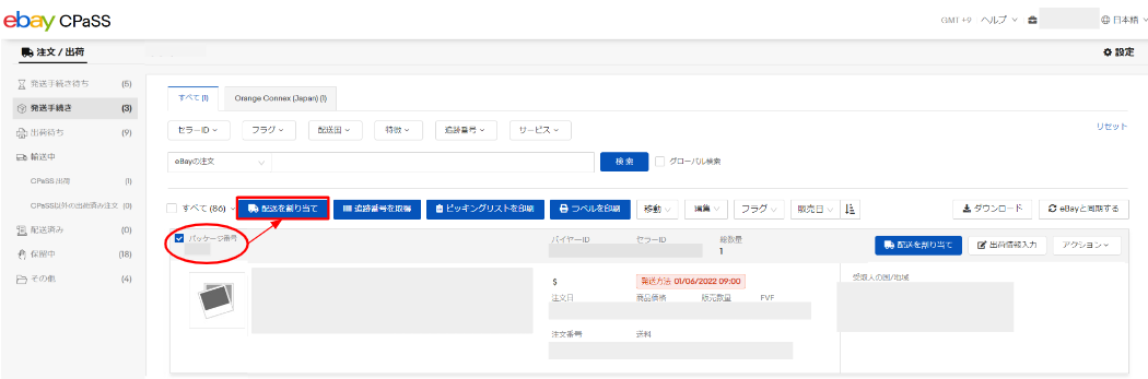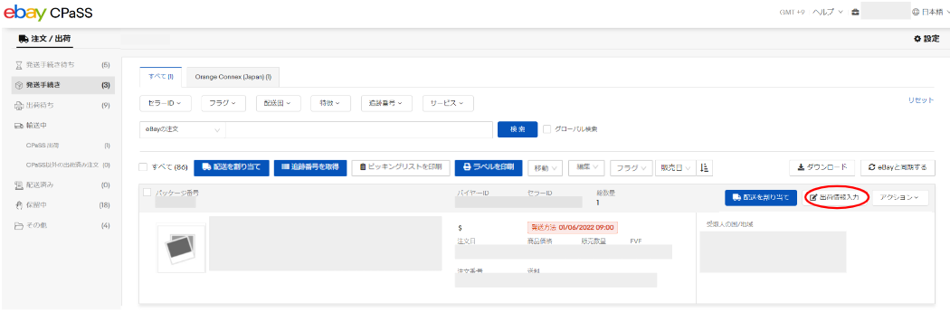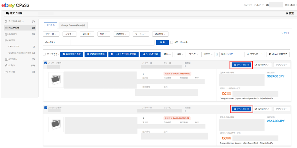 CPaSSでは同期された各注文が、取るべきアクションごとに分かれたタブで管理されています。 eBayサイトから同期された注文は、始めに発送手続き待ちタブに表示されます。