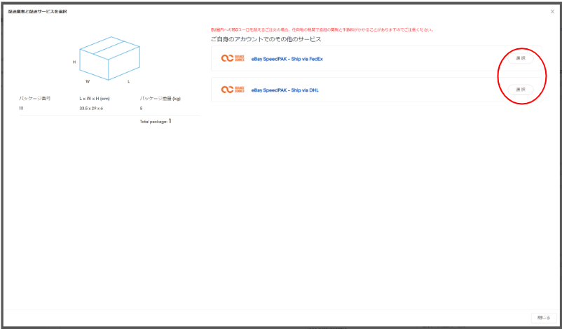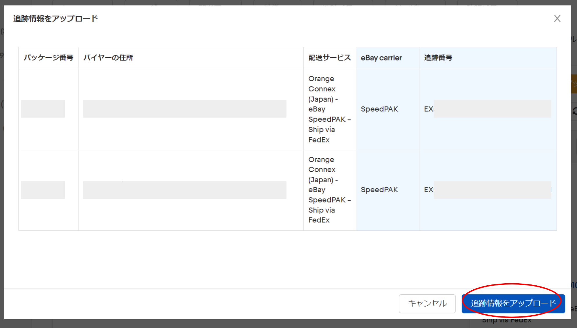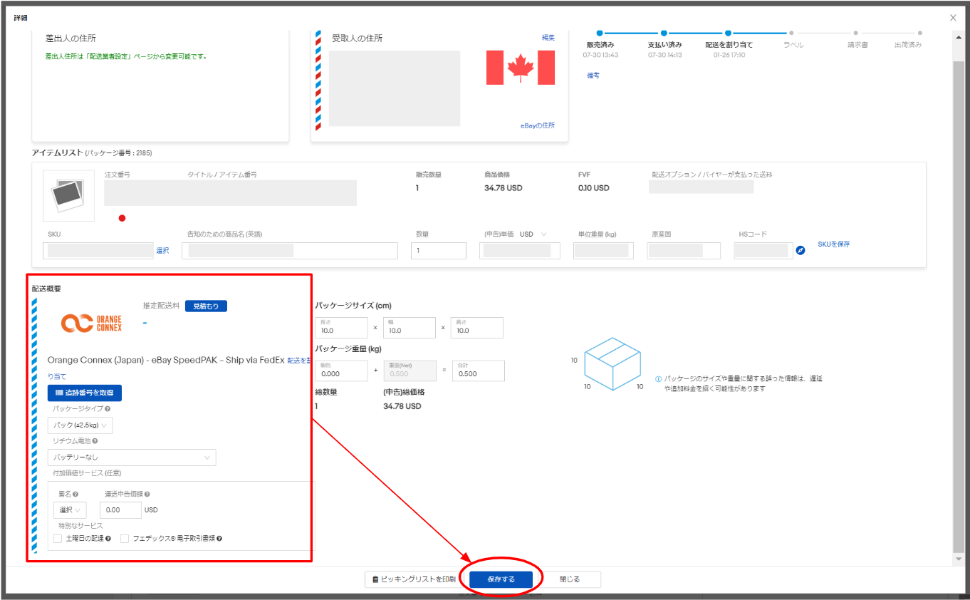 注文が[発送手続き]に移行したら、発送するために必要な注文情報を編集します。こちらの注文情報はeBayサイトから引用されます。