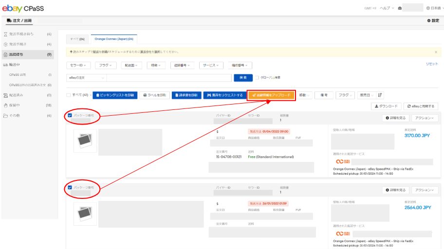 - 集荷リクエストが完了すると各注文欄の右下に「Scheduled pickup: ~~~」を表示されます。