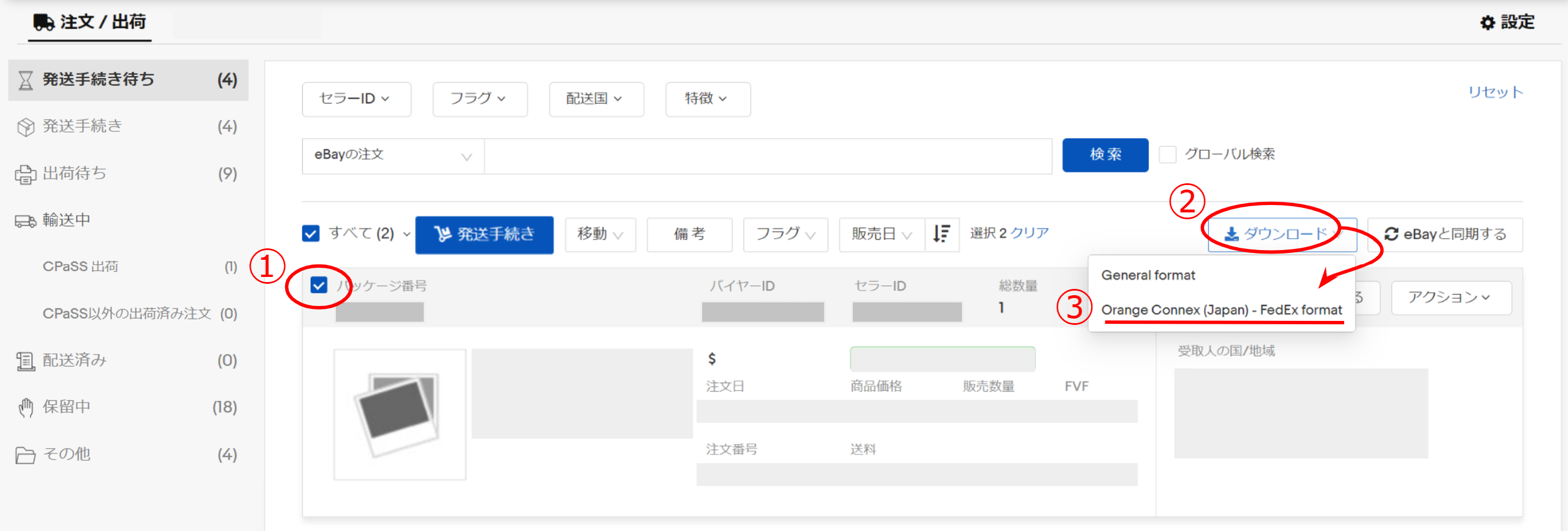 - 編集したい注文欄の左側にあるチェックボックスにチェックを入れ、[ダウンロード]>[Orange Connex (Japan) - FedEx format]をクリックしExcelファイルをダウンロードします。