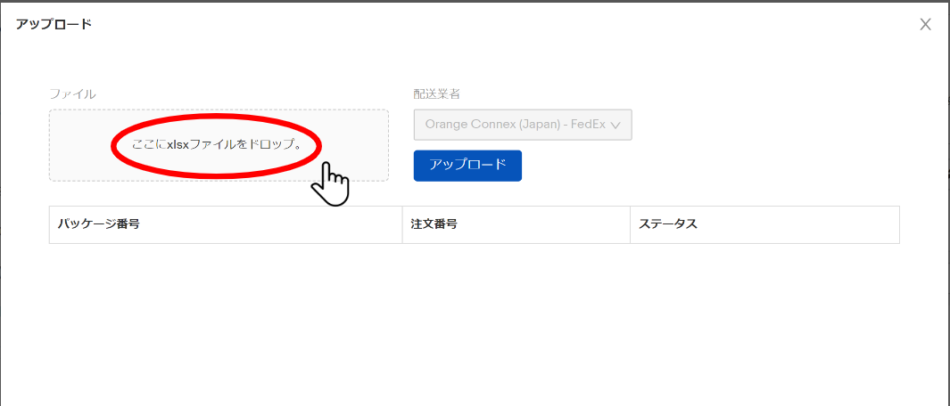 - 表示されたウィンドウの[ここにxlsxファイルをドロップ]をクリックし、Excelファイルを添付します。