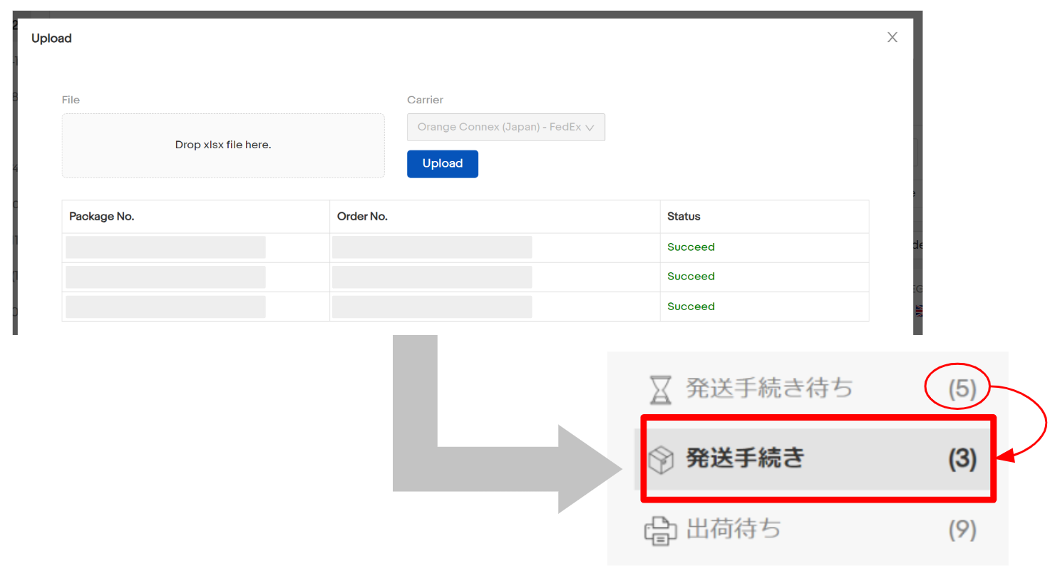 - 出荷情報のアップロードが完了すると[発送手続き]のタブに注文が移動します。