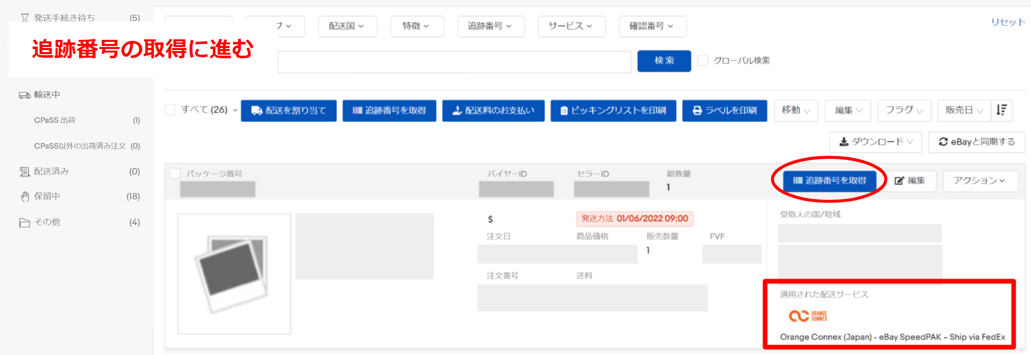 また、注文ごとに追跡番号の取得したい場合は、各注文欄にある[追跡番号を取得]をクリックすると、該当の注文に個別で追跡番号の取得ができます。