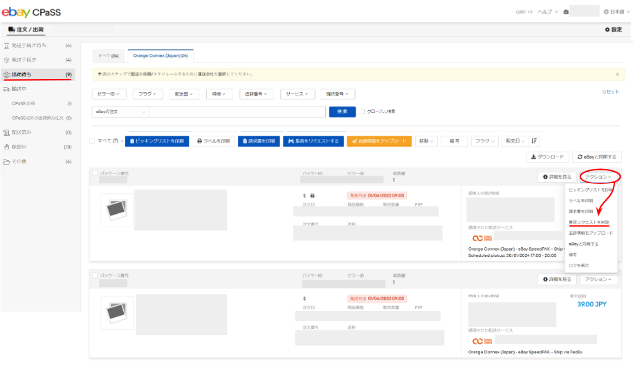 - その後、キャンセルされた注文は[出荷待ち]のタブに移動し、キャンセルをしたい注文欄の右側にある[アクション]>[集荷リクエストを削除]をクリックします。