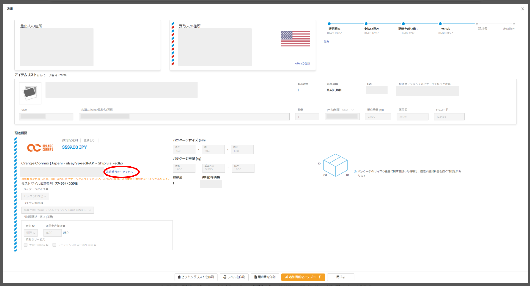 ※追跡番号が発行された後、上記のステップでキャンセルをしないと、配送料金が請求されます。