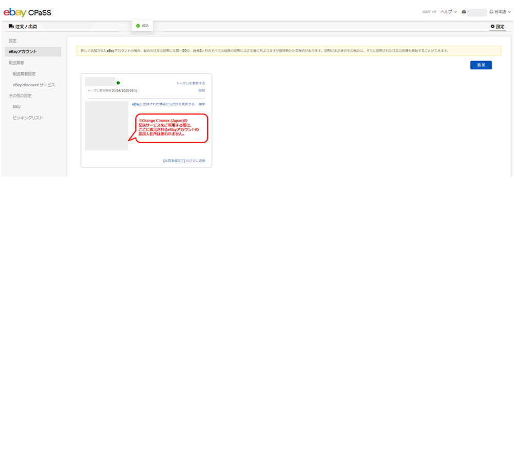 - eBayアカウントが追加されたら、ページのリフレッシュか再ログインをしてください。
